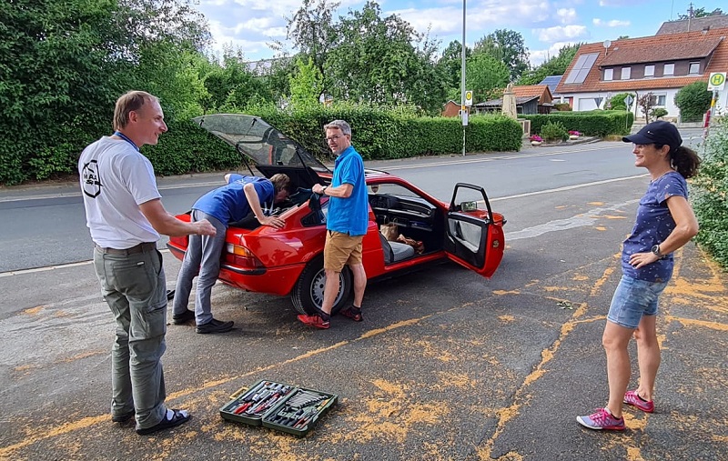 Am Sonntag Morgen hiess es für uns Südländer Abschied nehmen. Ca. 500 km lagen vor uns. Diese wurden bei einer Aussentemperatur von ca. 35°C ohne allzu grosse Probleme gemeistert. Gut, der 530er von Andreas verlangte nach etwas Zuwendung. Andreas hat den Bruch eines Kugelkopfes des Schaltgestänges routiniert mit einem Gummiband behoben. Hat rund 300 km bis in die Schweiz locker gehalten. Gewusst wie :-)